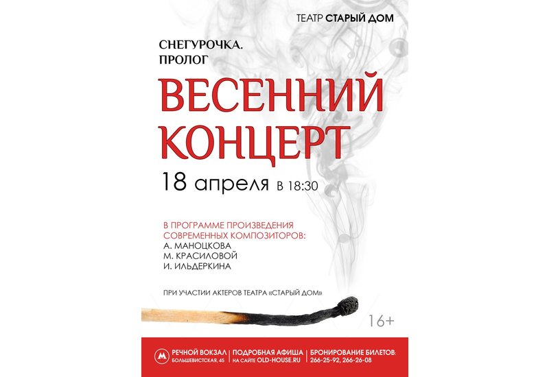 Новосибирск — город, который всегда интересовался современной музыкой. В нём есть и прекрасные современные композиторы, и публика, которой важно услышать новое. Театр «Старый Дом» становится площадкой встречи современной публики и современной музыки: в преддверии показа фантастической оперы «Снегурочка» состоится концерт, в котором прозвучит как музыка Александра Маноцкова (композитора оперы), так и музыка молодых новосибирских композиторов Ильи Ильдеркина и Марии Красиловой (музыкального руководителя постановки «Снегурочка»). В программе «Весеннего концерта»: фрагменты оперы в исполнении артистов театра, прекрасно освоивших эту сложную партитуру, инструментальная музыка в исполнении ансамбля под управлением Ильи Ильдеркина, песенные произведения в исполнении Александра Маноцкова.