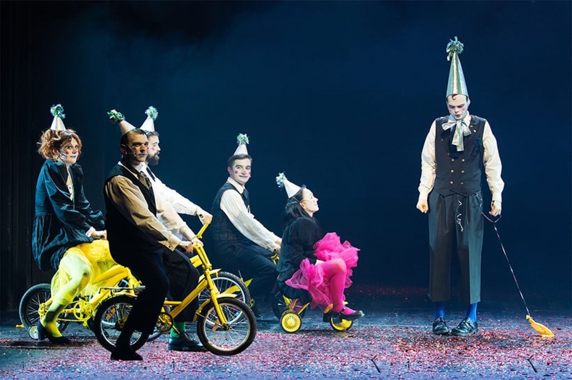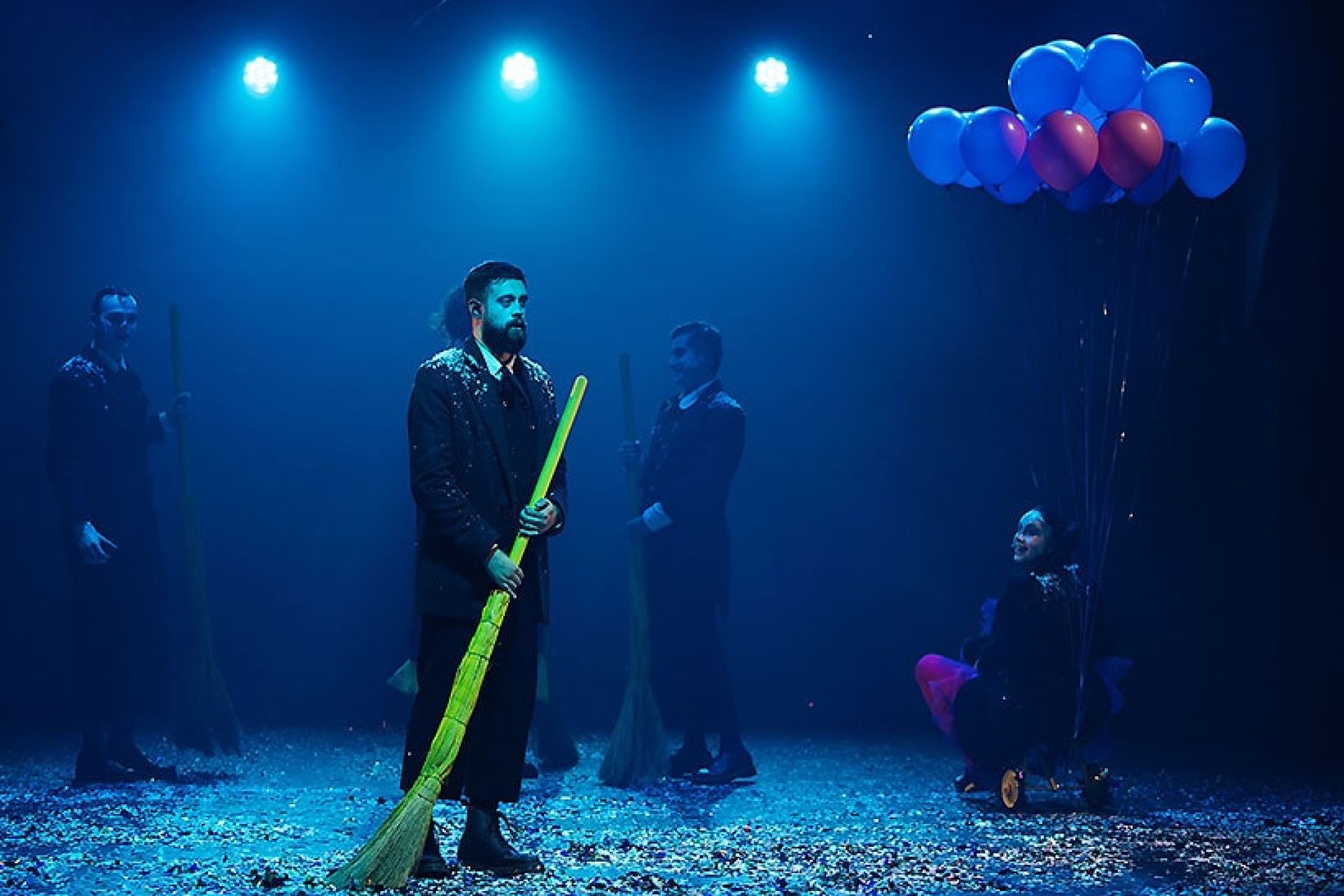 Но в череде бытового существования нас иногда «накрывает» иррациональным чувством, когда что-то большое и звёздное ласково смотрит на нас сверху, и мы замираем не в силах этому противиться. «Шарики-сударики блестят-шелестят, блестят-шелестят» — люди-дворники тихонько разгребают жёлтыми лопатами снег-конфетти и молитвенно бормочут хармсовскую мантру. Персонаж Софьи Степановой тихо катается по кругу на маленьком велосипеде, к которому привязана связка красных воздушных шариков. Зрители впадают в медитативный транс, и в мире больше нет ничего, кроме «шариков-судариков», больших жёлтых лопат, цветного конфетти и присутствия Хармса на первом ряду. Думаю, что его внутренний ребёнок ликовал и пел во время этой сцены. Впрочем, как и наш.