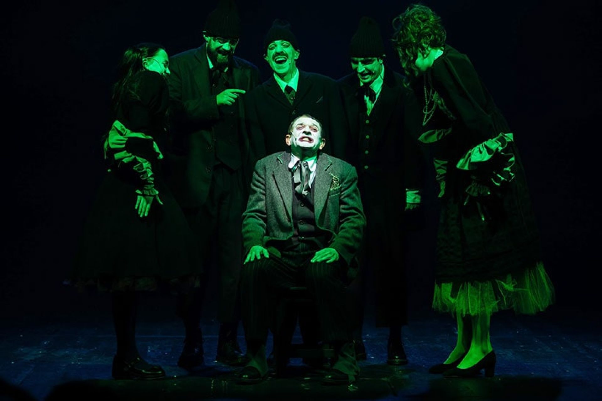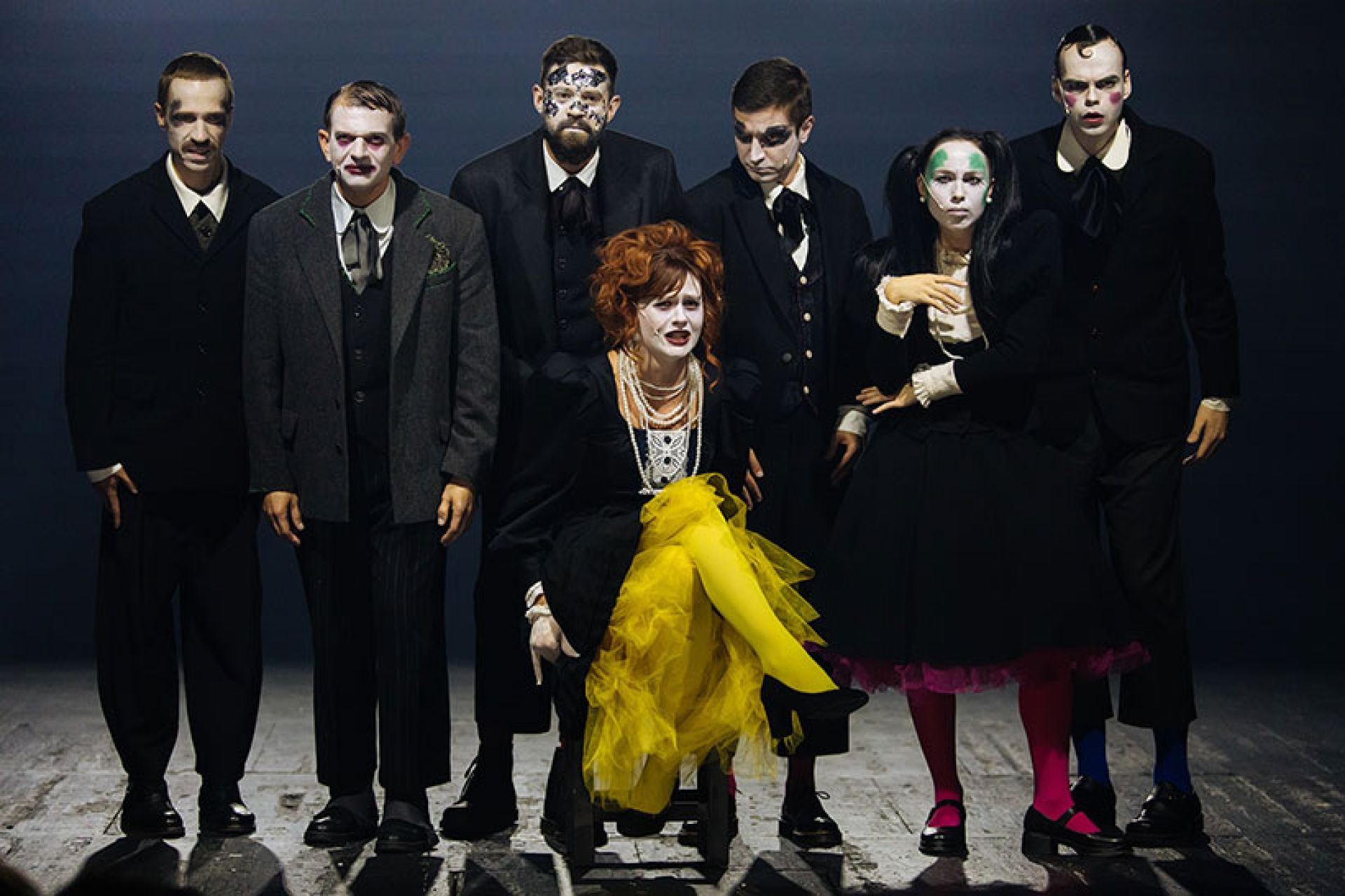«Фадеев, Калдеев и Пепермалдеев // однажды гуляли в дремучем лесу // Фадеев в цилиндре, Калдеев в перчатках // а Пепермалдеев с ключом на носу» — в «чёрном кабинете» сцены инфернально-нежно катаются на маленьких жёлтых велосипедах странные люди в чёрном, распевая тоненькими голосами известное стихотворение Даниила Хармса, которое он написал 18 ноября 1930 года. Хармсоведы уже не один десяток лет бьются над его расшифровкой, пытаясь нащупать тайный смысл: некоторые видят в нём аллюзии на индоевропейские мифологические символики, другие — описание масонского ритуала. Но режиссёр Арсений Мещеряков, поставивший «Скасску», и бесстрашные артисты, с головой нырнувшие в макабрический омут хармсовского мира, намекают зрителю: этот текст существует только внутри себя самого, а все попытки расшифровать его с помощью привычного логичного инструментария лишат его потустороннего очарования.