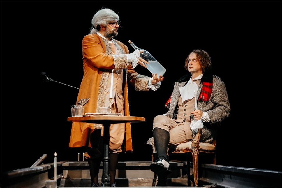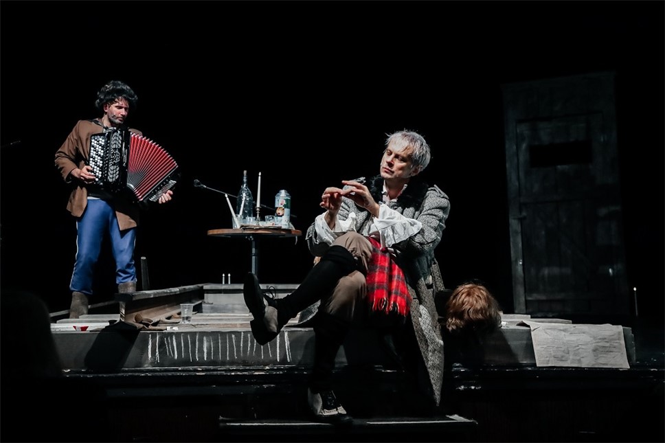 Или вот "Опыты драматических изучений. Моцарт и Сальери" от БДТ в постановке Александры Толстошевой. Два артиста (Андрей Феськов и Павел Юринов) снова и снова проигрывают на сцене пушкинский текст. Импровизируют, активно общаются с залом, не скрывают, что они – не персонажи, а артисты, изображающие Моцарта и Сальери. И музыкант (Владимир Розанов) – не то сам Пушкин, не то музыкант Володя. Тот самый слепец со скрипкой, только вместо скрипки у него баян…